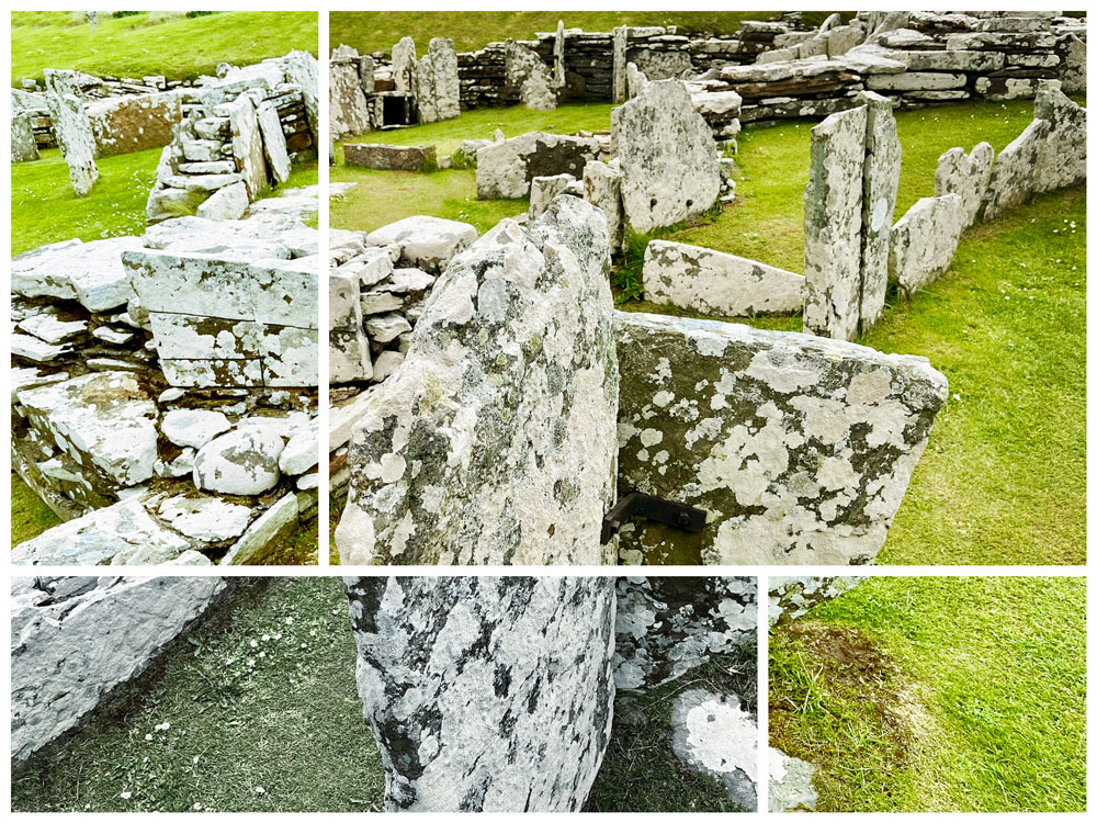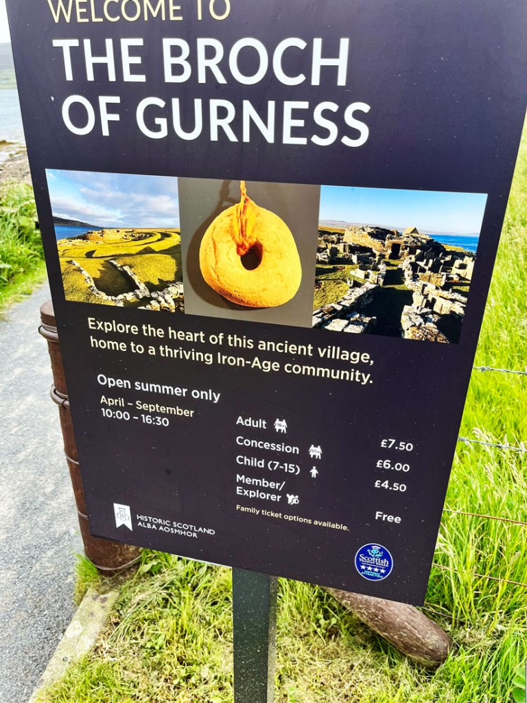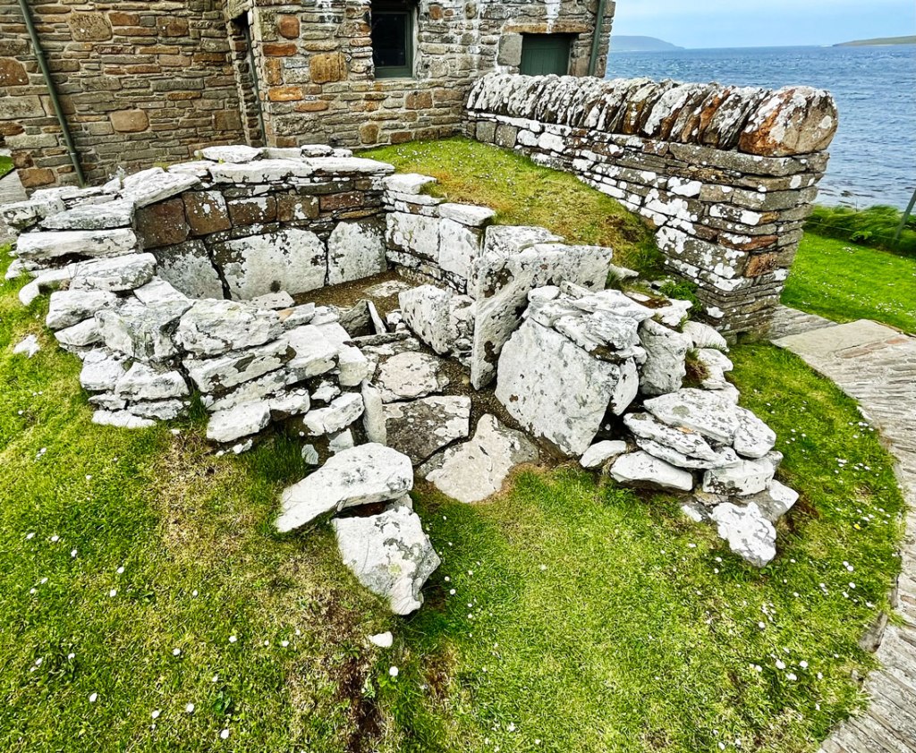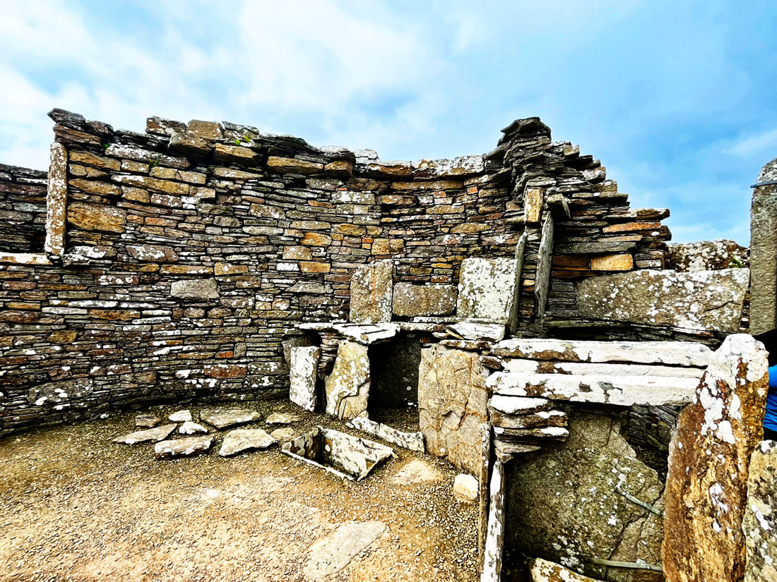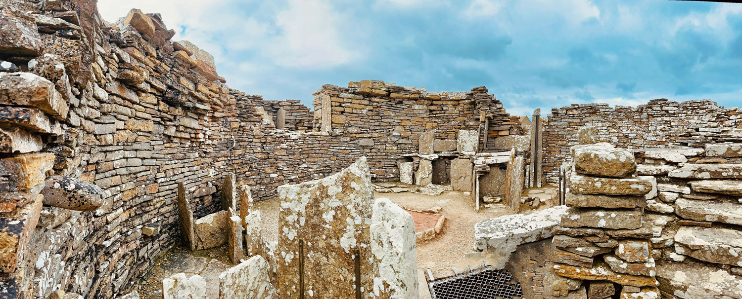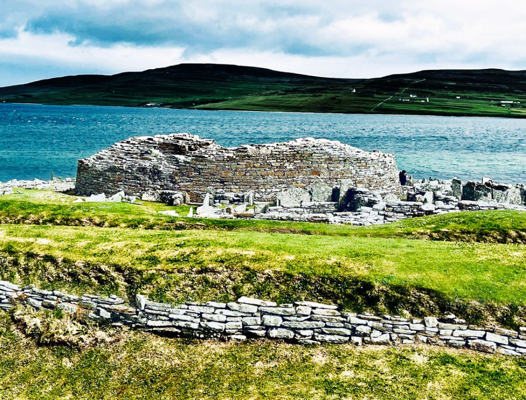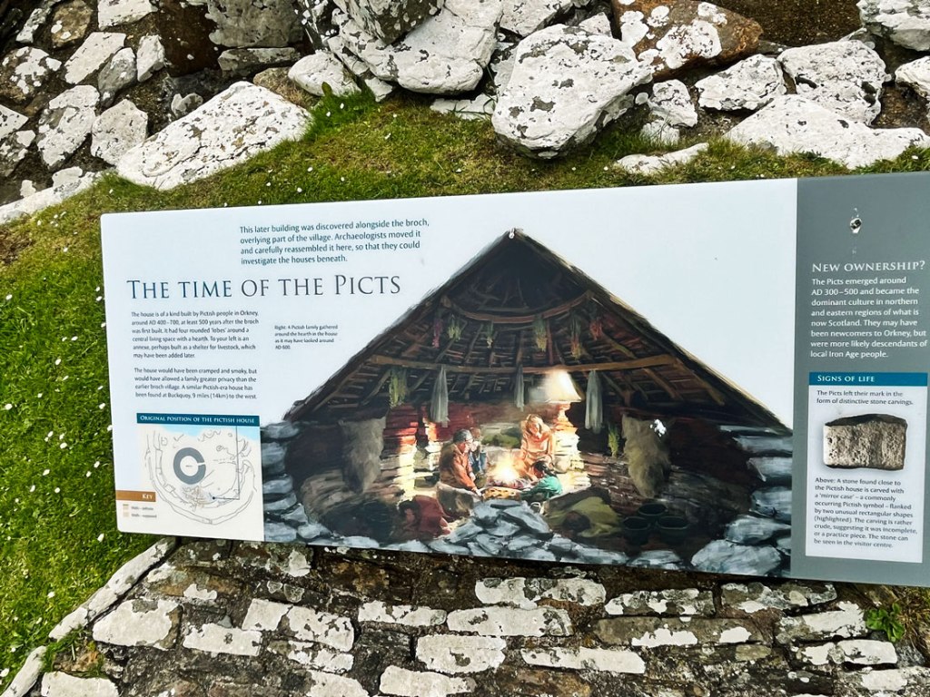 Settlement here began sometime between 500 and 200 BC. At the centre of the settlement is a stone tower or broch, which once probably reached a height of around 10 metres. Its interior is divided into sections by upright slabs.