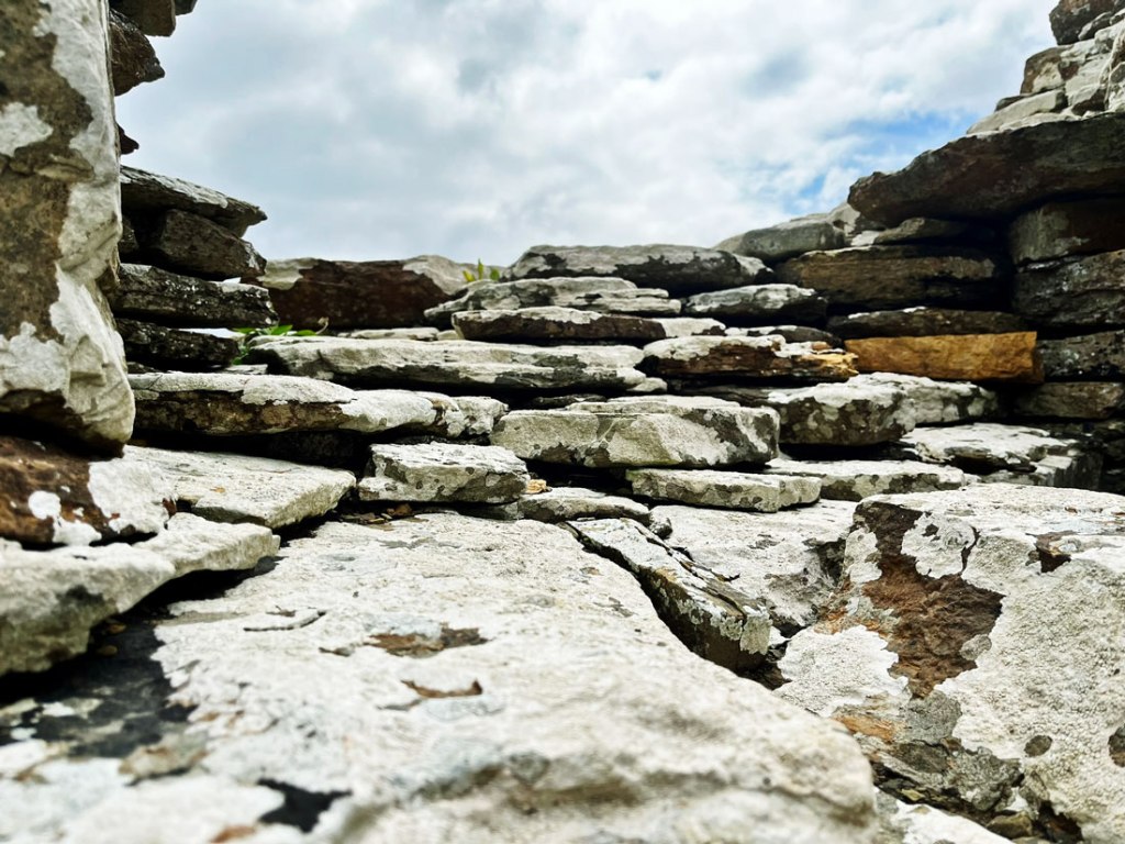 The tower features two skins of drystone walls, with stone-floored galleries in between. These are accessed by steps. Stone ledges suggest that there was once an upper storey with a timber floor.