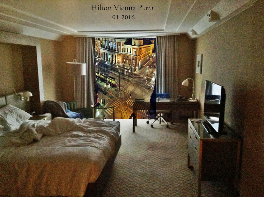 Our hotel room on the Executive floor at the Hilton Vienna Plaza. I’ve added the view from our room.