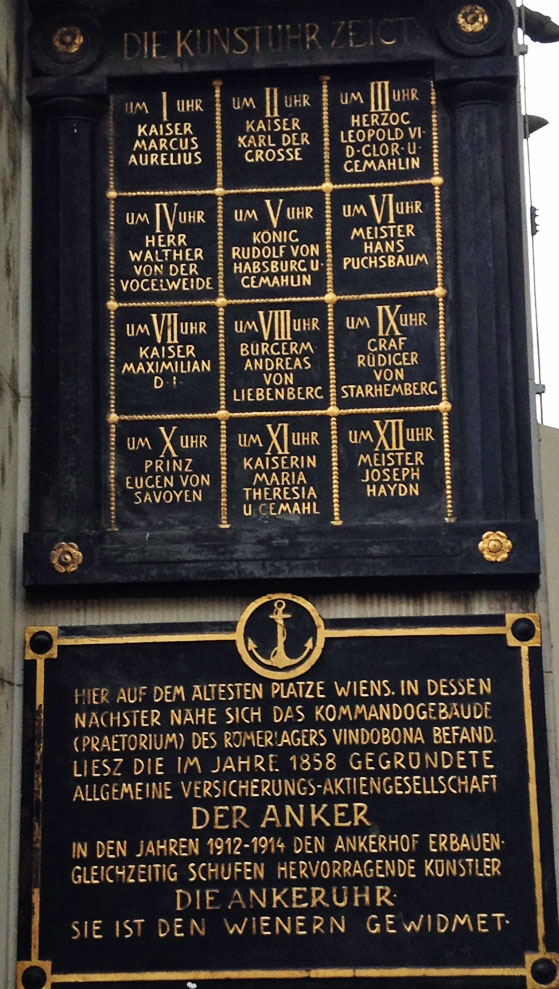 If you take a closer look you will recognize that the Ankeruhr is in fact an approx. 10 meter wide and approx. 7 meter high bridge. It connects the both parts of the Ankerhof buildings. The diameter of the clock itself is approx. 4 meter. As a tribute to popular historical personalities there are figures made of cooper in the clock.