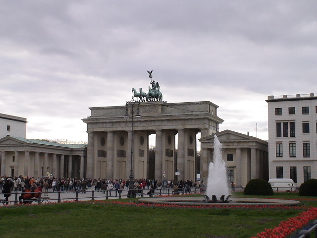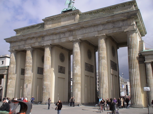 The Brandenburg Gate is a former city gate and the symbol of Berlin. It is located between the Pariser Platz and the Platz des 18. März and is the only remaining gate of a series through which one formerly entered Berlin. One block to its north lies the Reichstag. It constitutes the monumental termination of Unter den Linden, the renowned boulevard of Lime trees which led directly to the royal residence. Hitler had ordered the removal of all the Lime trees because he did not want anything obstructing the view of his military parades.