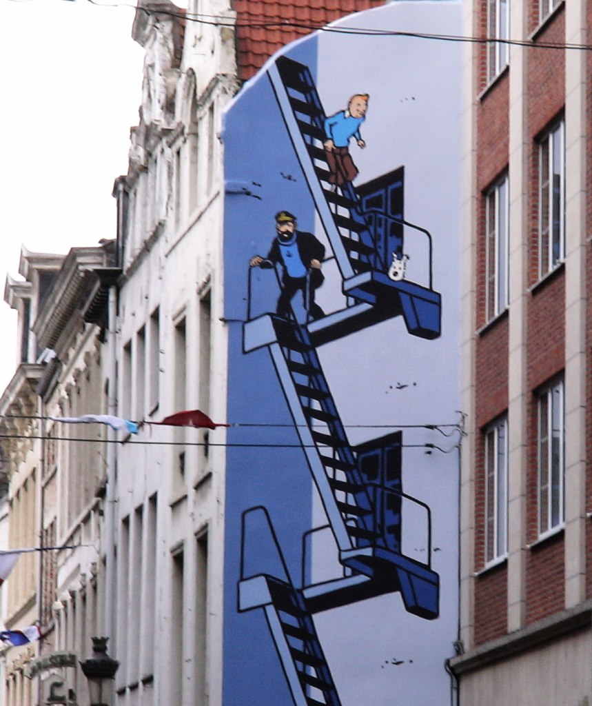 There are currently 18 large comic strip images decorating the sides of buildings around Brussels city center. This outdoor exhibition is known as the comic strip route and is organized by the Belgian Center for Comic Strip Art and the city of Brussels. Begun in 1991 as a tribute to Belgium’s talent for comic strip art, this street art project continues to grow.
