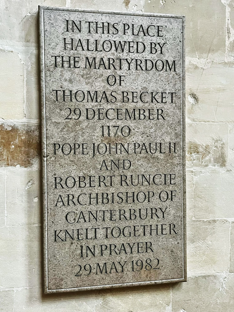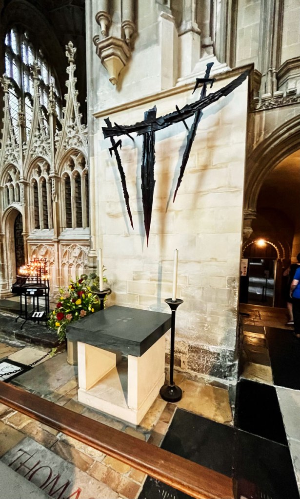 In 1986, a new Martyrdom Altar was installed in the northwest transept, on the spot where Thomas Becket was slain, the first new altar in the cathedral for 448 years. Mounted on the wall above it, there is a metal sculpture by Truro sculptor Giles Blomfield depicting a cross flanked by two bloodstained swords which, together with the shadows they cast, represent the four knights who killed Becket.