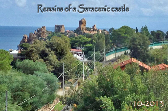 On the summit of the promontory are extensive remains of a Saracenic castle. The town’s fortifications formerly extended to the shore, on the side where the modern town now is, in the form of two long walls protecting the port