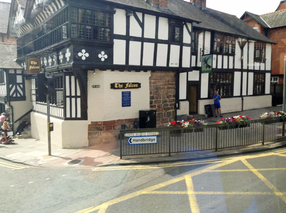 The Falcon Inn: The building originated as a house in about 1200 and was later extended to the south along Lower Bridge Street, with a great hall running parallel to the street. During the 13th century it was rebuilt to incorporate its portion of the row. It was rebuilt again during the late 16th and early 17th centuries.