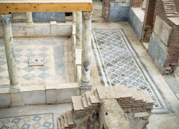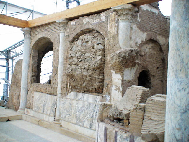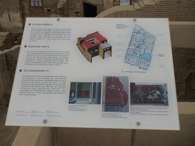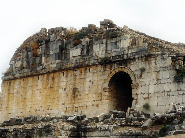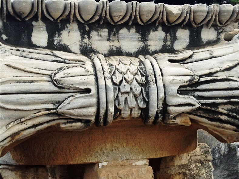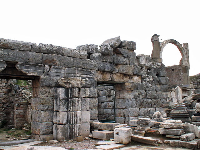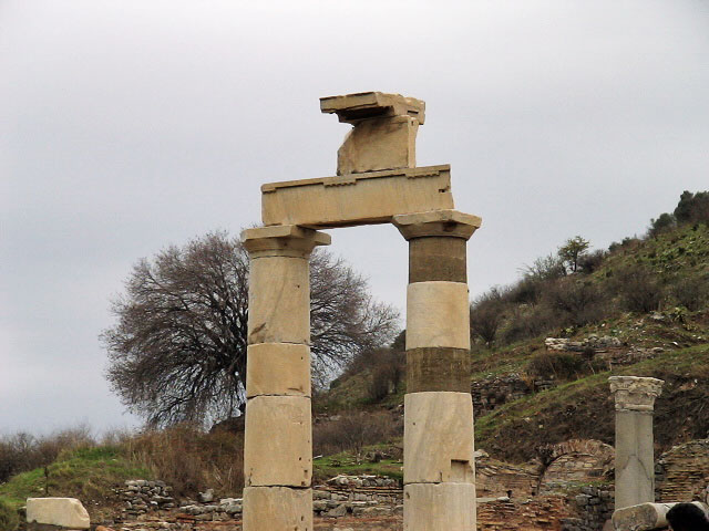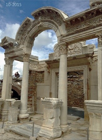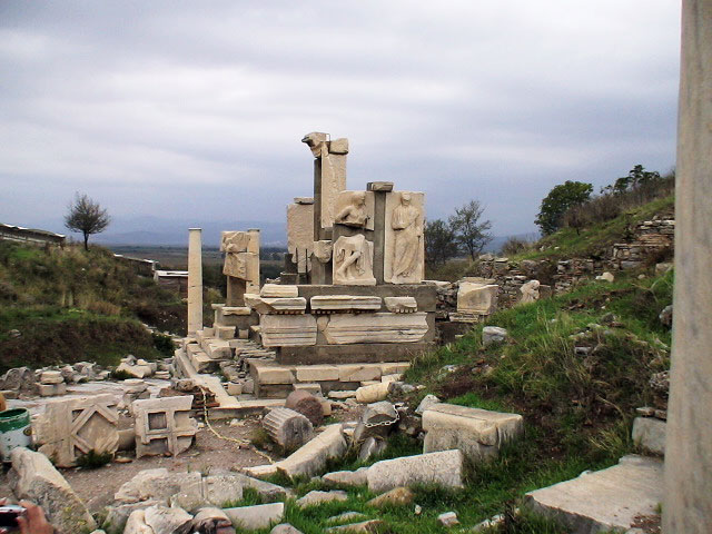 The Temple of Hadrian dates from the 2nd century but underwent repairs in the 4th century and has been re-erected from the surviving architectural fragments. The reliefs in the upper sections are casts, the originals now being exhibited in the Ephesus Archaeological Museum.