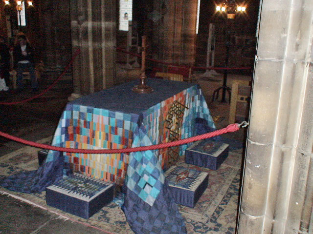The Tomb stands in a space formed by four columns directly below the site of the altar above and is designed to carry its weight. The colourful, embroidered cloth and six kneelers, were made and given by Embroiders’ Guild (West of Scotland Branch) and were dedicated on 12th April, 1973 in the presence of HRH the Princess Margaret.