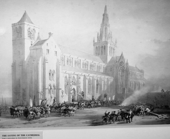 Painting of David Robert shows St. Mungo Cathedral in the 16th century, during protestant revolution. It is called: “The saving of the Cathedral.”