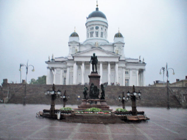 The statue of Tsar Alexander II in front of the Cathedral on a wet afternoon. He was beloved by the Finns because he had let them be themselves.