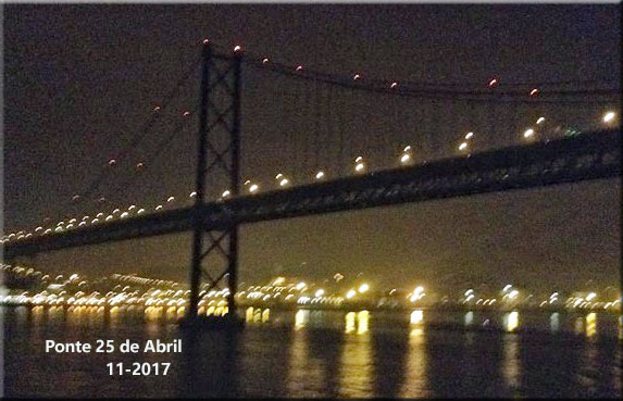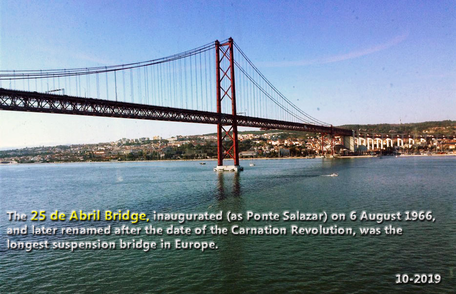 The 25 de Abril Bridge is a suspension bridge connecting the city of Lisbon to the municipality of Almada on the left (south) bank of the Tagus River. It was inaugurated on August 6, 1966, and a train platform was added in 1999. Because it is a suspension bridge and has similar coloring, it is often compared to the Golden Gate Bridge in San Francisco, US. It was built by the American Bridge Company which constructed the San-Francisco-Oakland Bridge, but not the Golden Gate. ¨