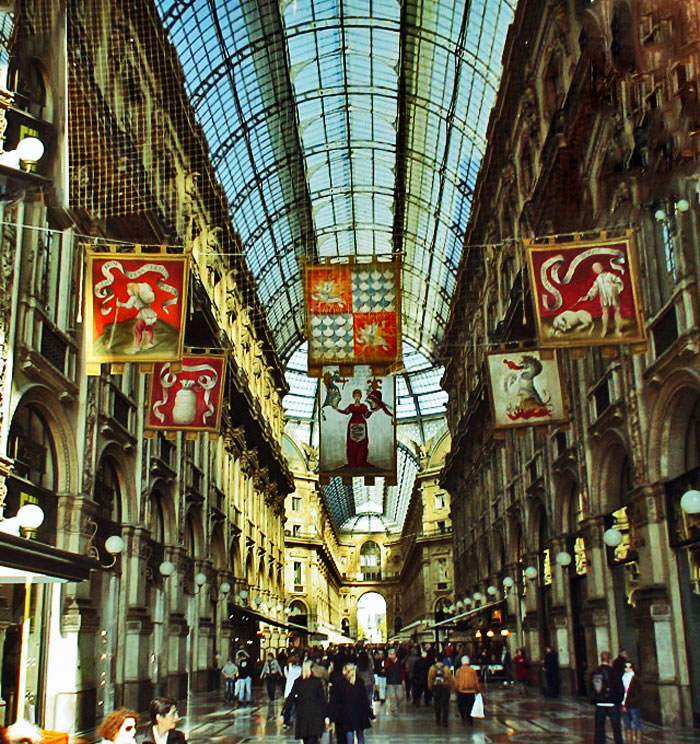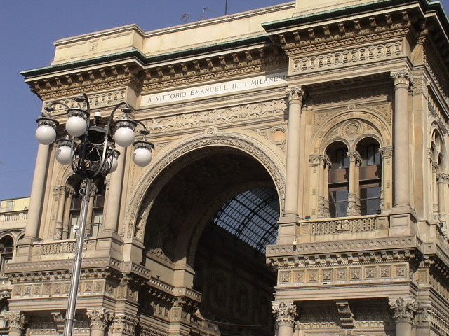 The Galleria Vittorio Emanuele II is a covered double arcade formed of two glass-vaulted arcades at right angles intersecting in an octagon, prominently sited on the northern side of the Piazza del Duomo, and connects to the Piazza della Scala. Named after Vittorio Emanuele II, the first king of united Italy, it was originally designed in 1861 and built by Giuseppe Mengoni between 1865 and 1877.