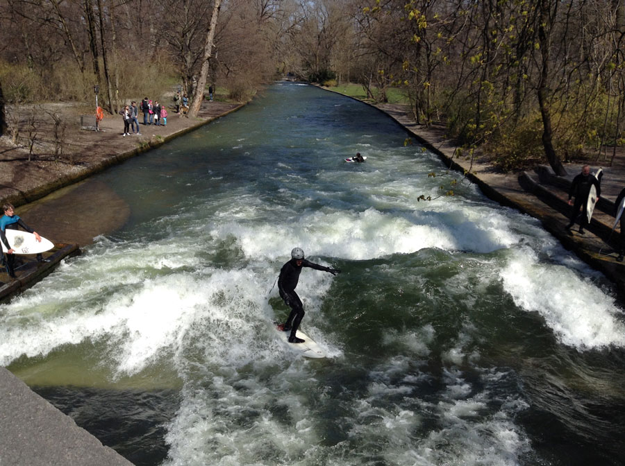 Surfing! On a stretch of the river known as the Eisbach – a tributary of the Isar which runs directly through the English Garden.