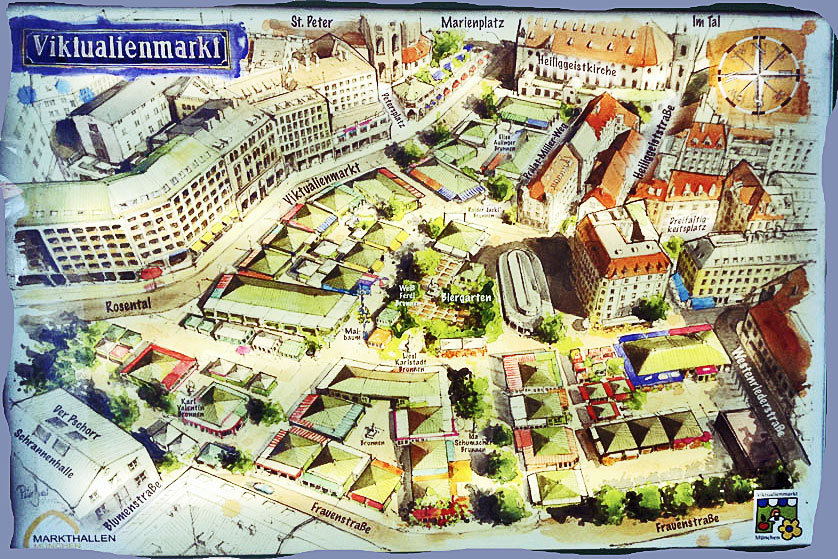 When the food market of the city had grown too large for the central square Marienplatz, King Maximilian I issued a decree in 1807 to have it moved a few metres to the south-east, to the square between Heiliggeist-Kirche and Frauenstraße. Charity buildings that had once belonged to the church were demolished to make way for the market square or “Markplatz”, which only much later came to be known as “Viktualienmarkt” or victuals market.