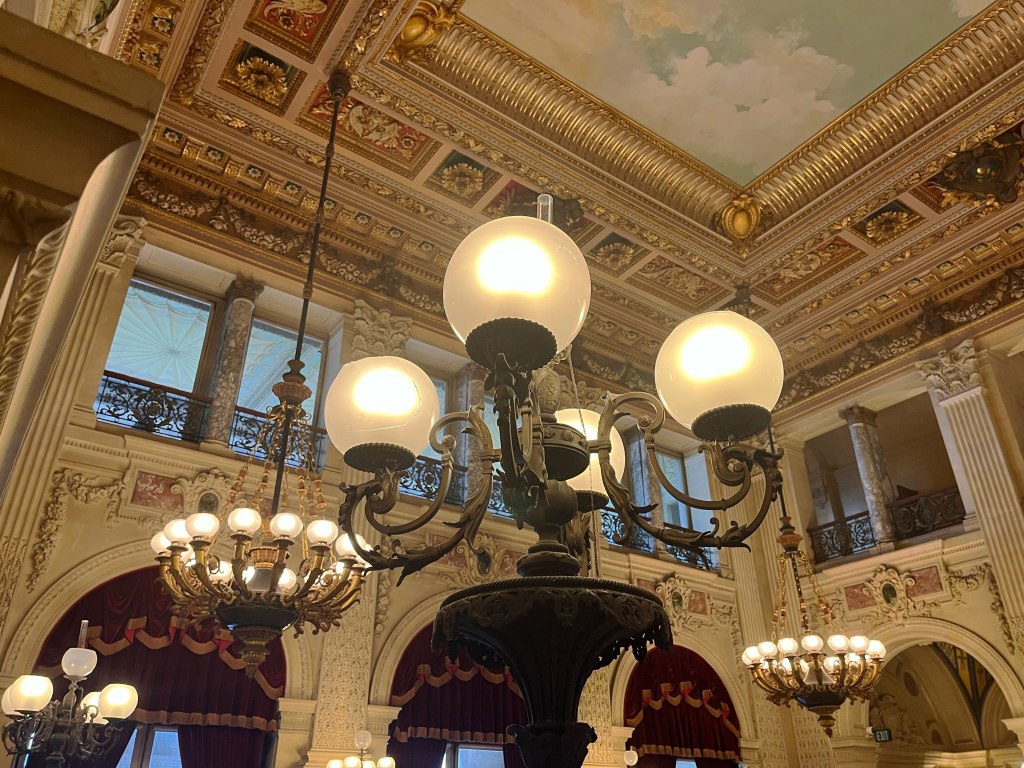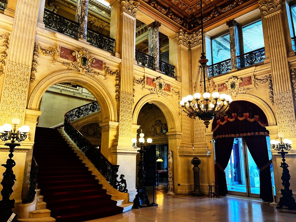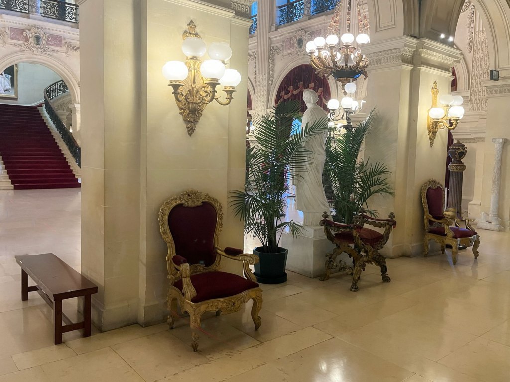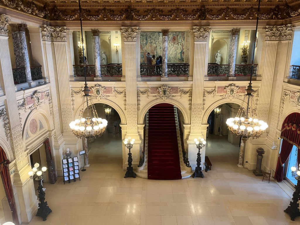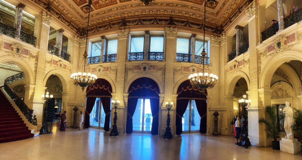 Gold and silver leaf, blue grey Campan marble from France, mirrors, and crystal light fixtures combine to mkae a glittering effect for evening concerts and receptions.