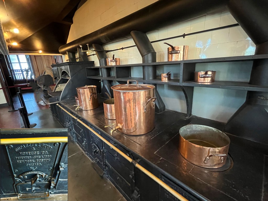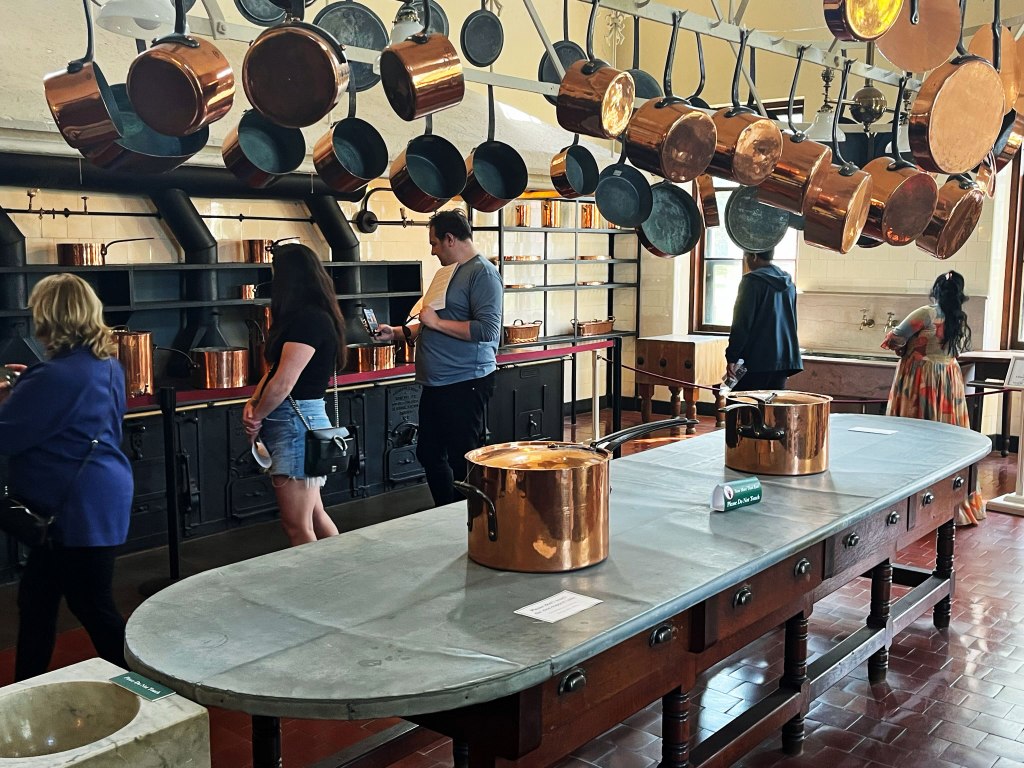 The kitchen was placed in a separate wing to prevent the potential spread of fire, cooking odors and noise into the main house. The French style cast iron stove was heated by coal and wood. The center worktable is covered in zinc, and the copper pots and pans are late 19th century pieces donated to the house. Countess Széchenyi (Gladys Moore Vanderbilt) donated the original pots to the scrap metal drive during WWII.