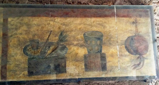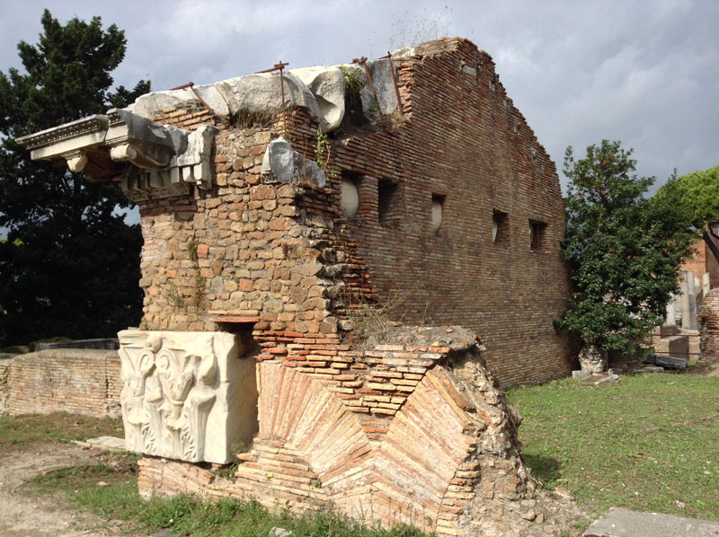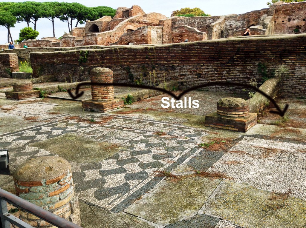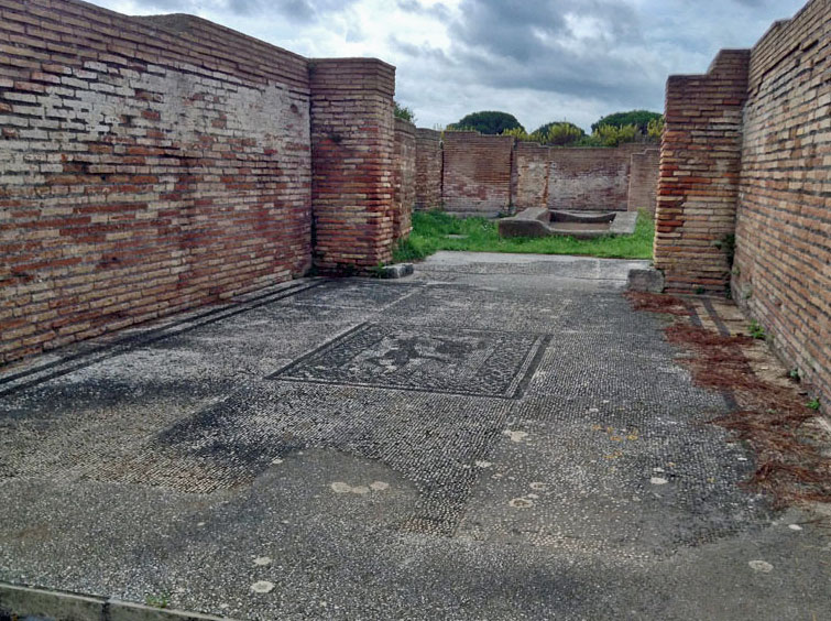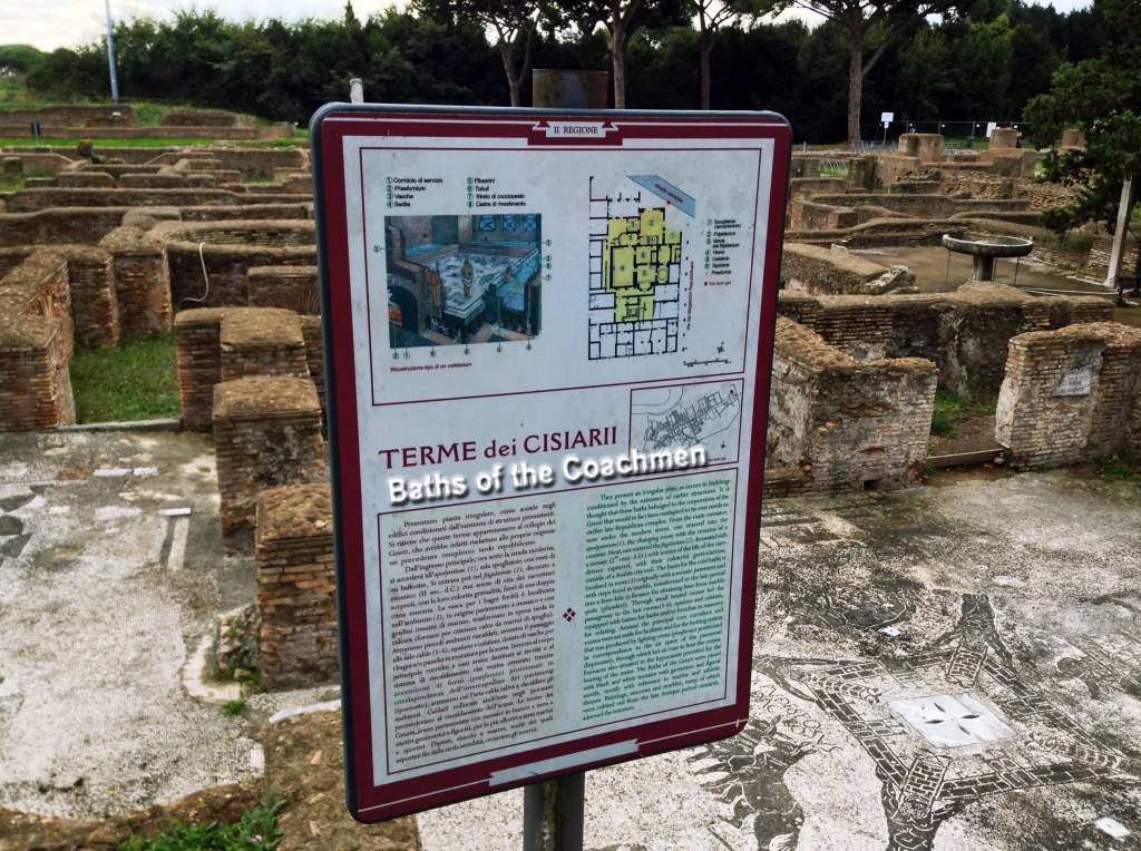 The Baths of the Coachmen were built during the early reign of Hadrian and modified extensively in the second half of the third century. The coaches are depicted on a large mosaic. They may be compared to cabs, used for transport to and from Rome – not everybody had a horse at his disposal. The cabs were stationed outside the baths, near the Roman Gate. A long basin on the other side of the street may well have contained the drinking water for the animals that pulled the wagons. It has been suggested that the guild of the coachmen owned the baths, but that is speculation. Taking a bath here would be tempting, after a long trip on the dusty Via Ostiensis.