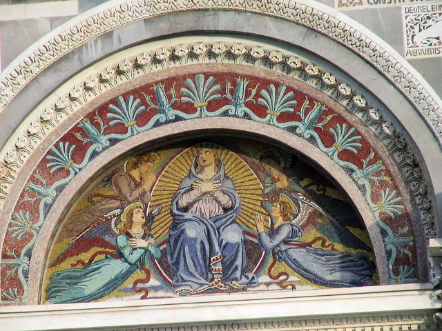 Lunette above the middle door of the cathedral, picturing Blessed Mary by Giuseppe Modena da Lucca. (On the right)