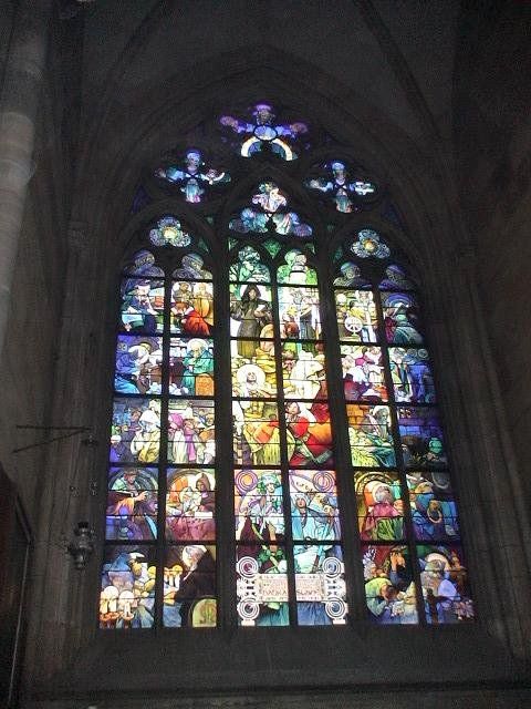 The Mucha window in Prague’s St. Vitus Cathedral was designed in the early 1930s.(Alfons Maria Mucha (July 24, 1860?July 14, 1939) was a Czech Art Nouveau painter and decorative artist.)