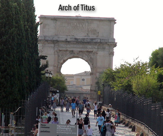 The Arch of Titus is a marble triumphal arch with a single arched opening, located on the Via Sacra just to the south-east of the Forum. It was constructed by the emperor Domitian shortly after the death of his older brother Titus, commemorating the capture and sack of Jerusalem in 70, which effectively terminated the Jewish War begun in 66 (although the Romans did not achieve complete victory until the fall of Masda in 73).
