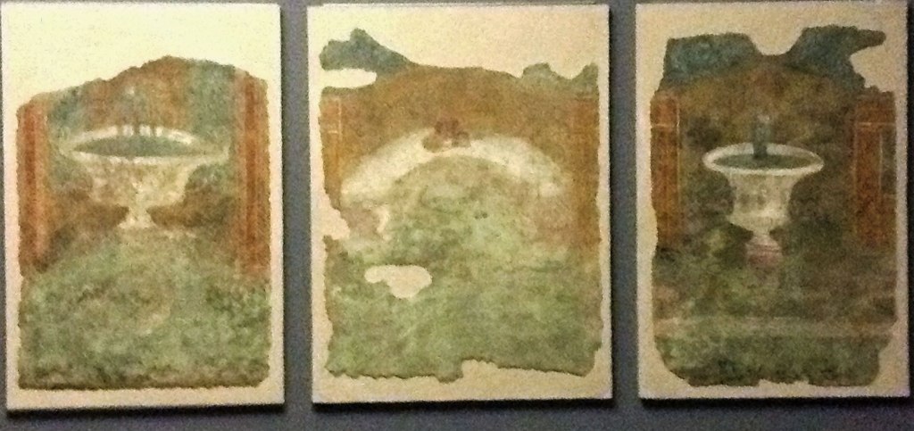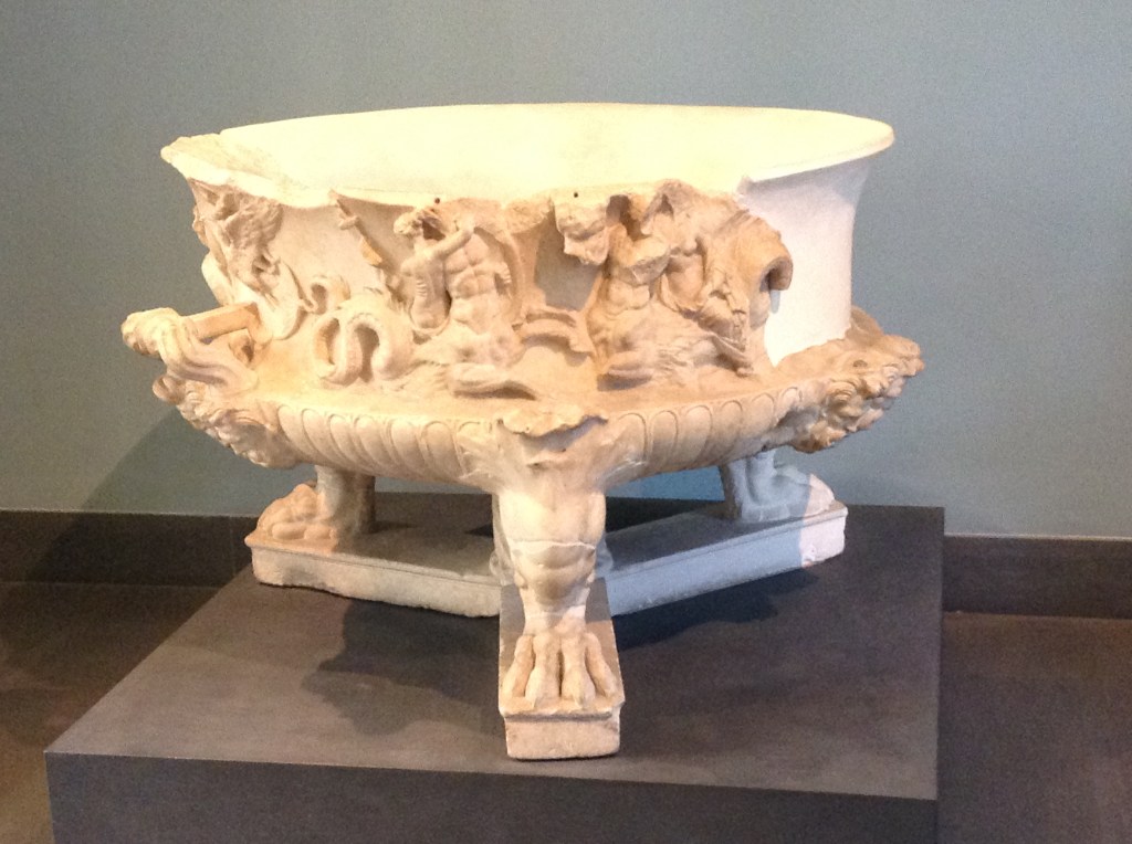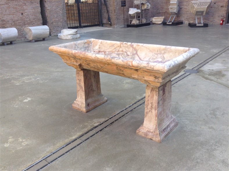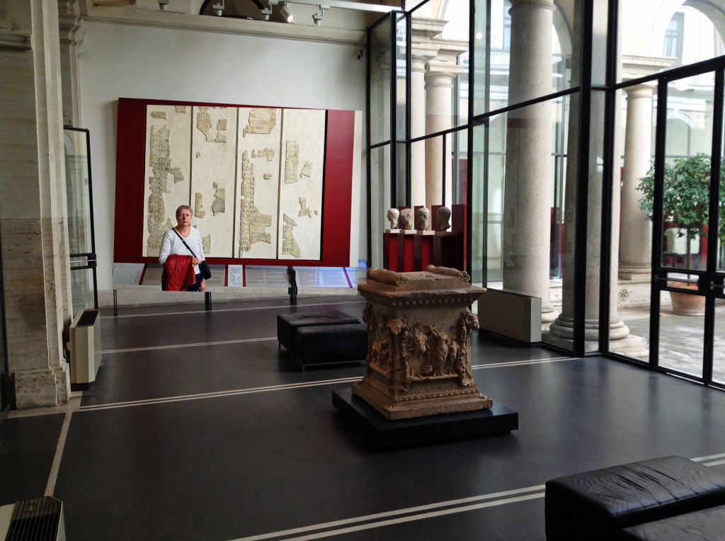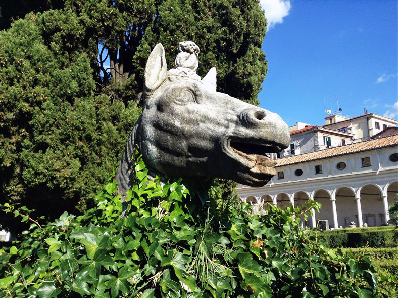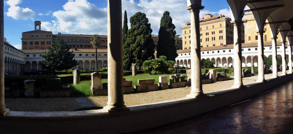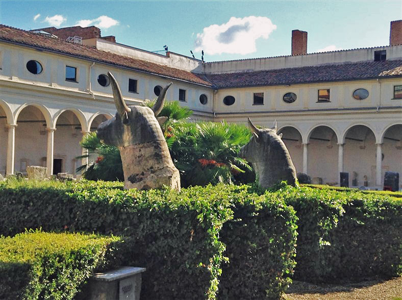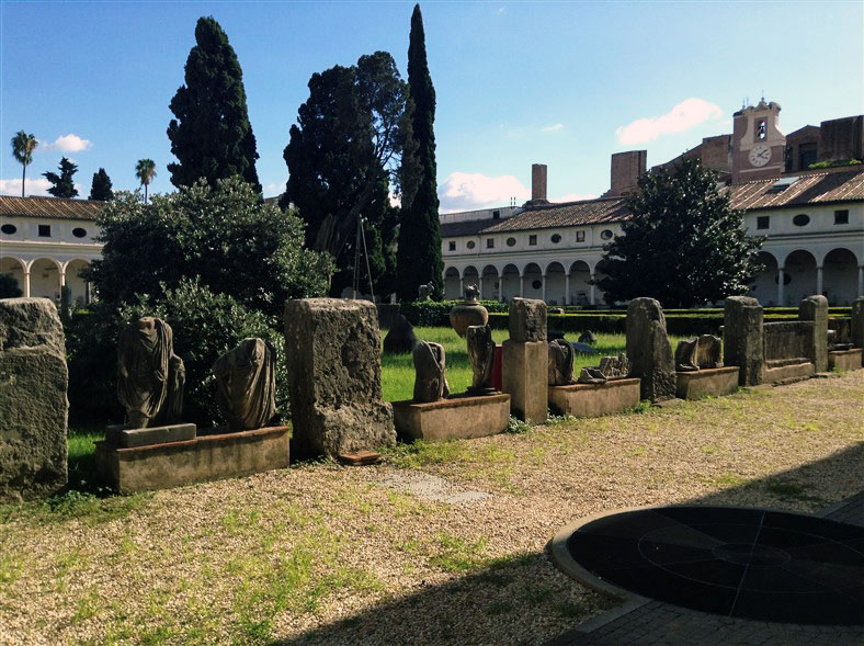Inside the square of the cloister, a 16th-century garden features outdoor displays of altars and funerary sculpture and inscriptions. These notably include some colossal animal heads, several of which date from Antiquity and were found near Trajan’s Column in 1586.
