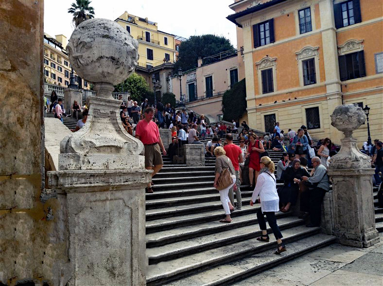 The Spanish Steps climb a steep slope between the Piazza di Spagna at the base and Piazza Trinita dei Monti, dominated by the Trinita dei Monti church at the top.
