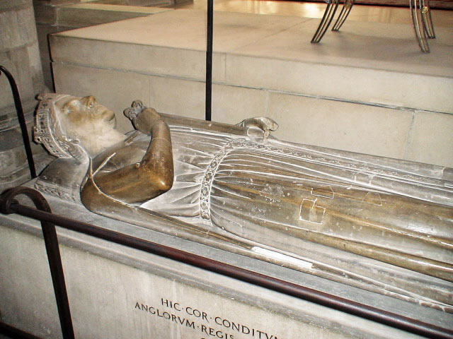 It contains a tomb of Richard the Lionheart which contains his heart. His bowels were buried within the church of the Chateau of Châlus-Chabrol in the Limousin. It was from the walls of the Chateau of Châlus-Chabrol that the crossbow bolt was fired, which led to his death once the wound became septic. His corporal remains were buried next to his father at Fon tevraud Abbey near Chinon and Saumur, France.
