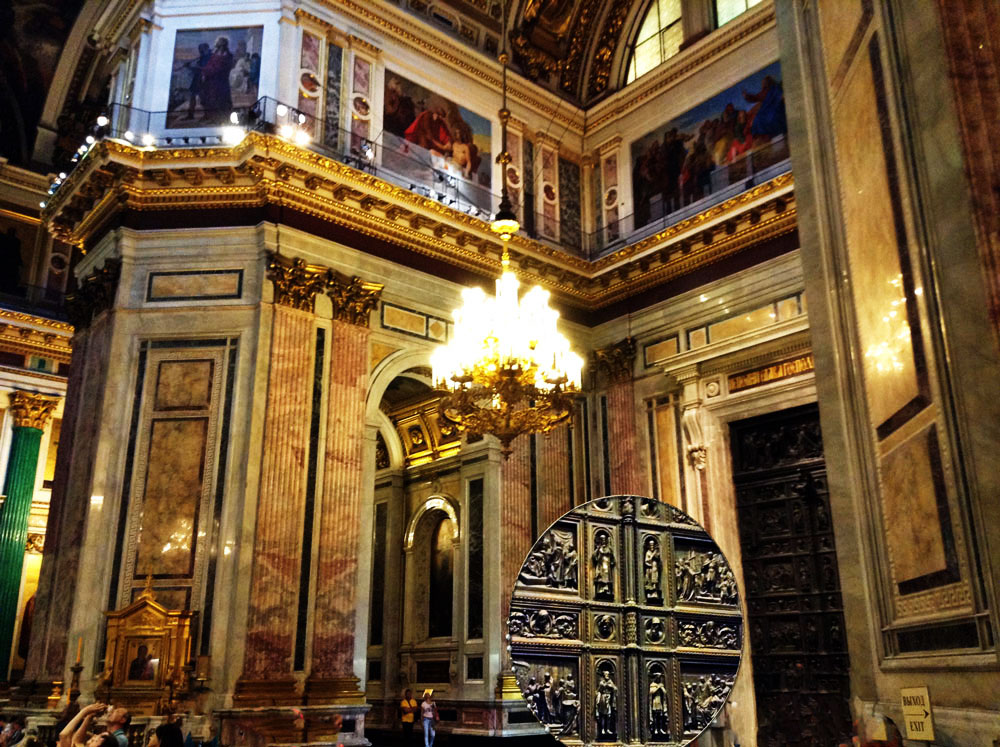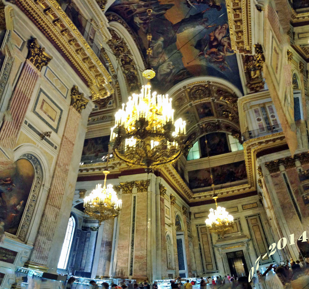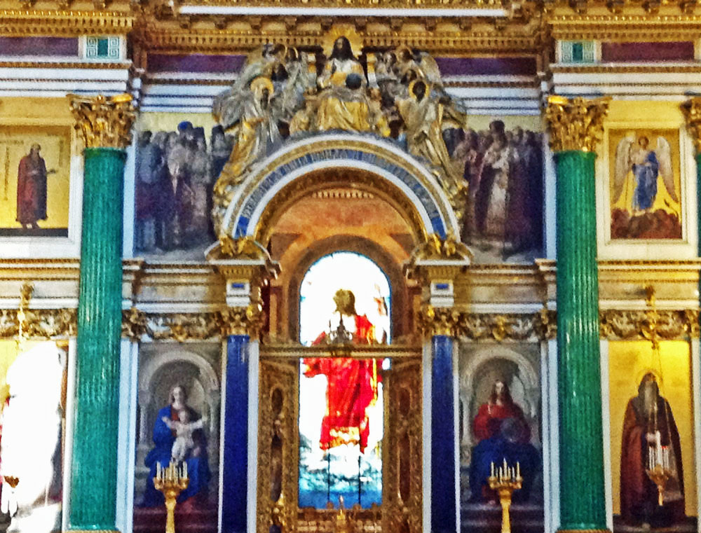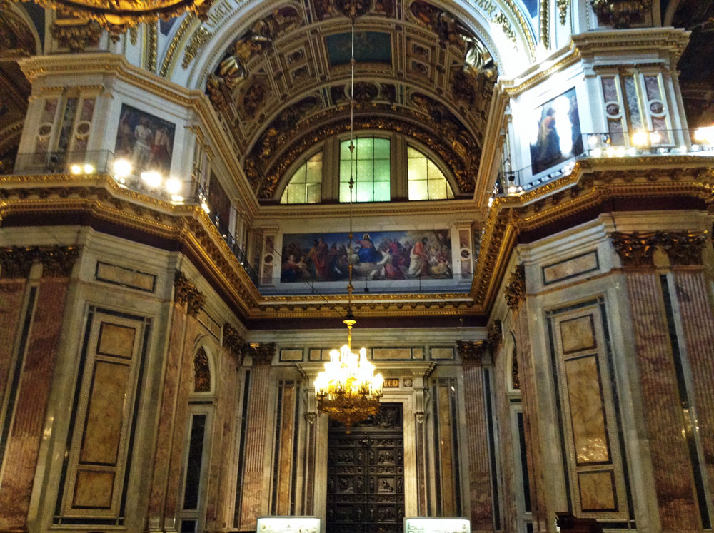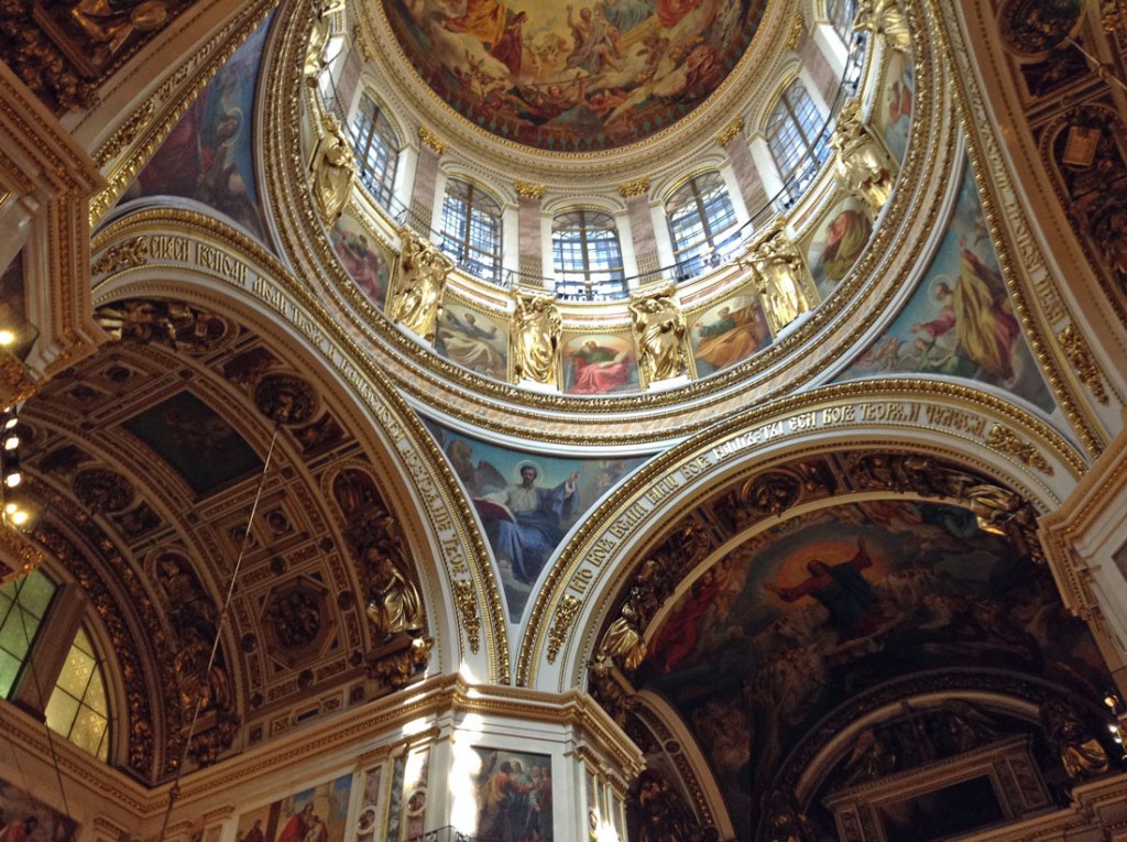 The Saint Isaac’s Cathedral took 40 years to construct, from 1818 to 1858. Under the Soviet government, the building was abandoned, then turned into a museum of atheism. During WW II, the dome was painted over in gray to avoid attracting attention from enemy aircraft. With the fall of communism, the museum was removed, and regular worship activity has resumed in the cathedral, but only in the left-hand side chapel.