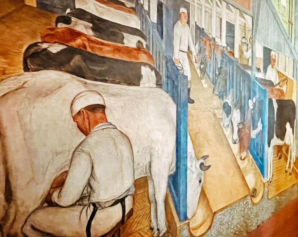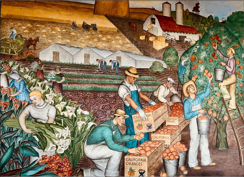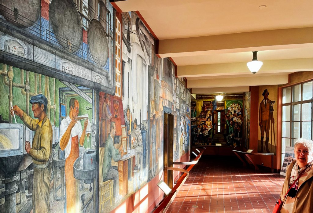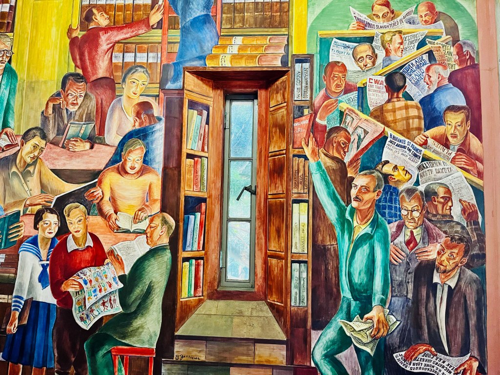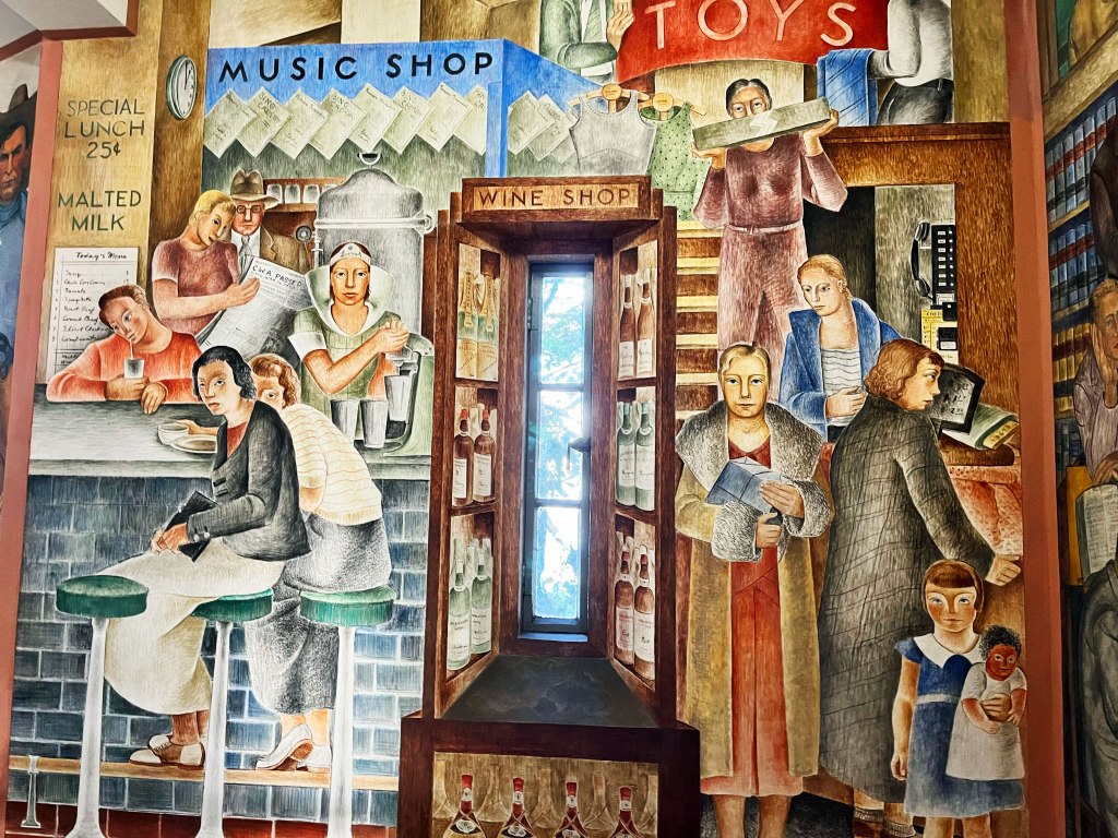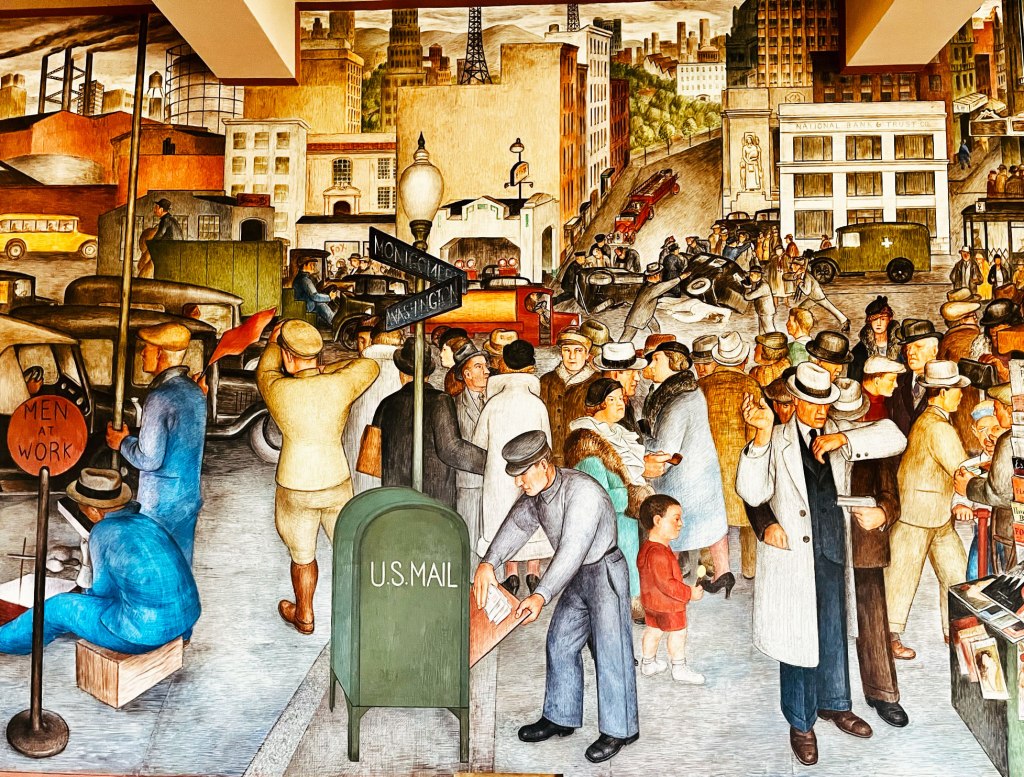 The murals inside the tower’s base were painted in 1934 by a group of artists employed by the Public Works of Art Project, a precursor to the Works Progress Administration (WPA), and depict life in California during the Depression. When violence broke out during the 1934 longshoremen’s strike, controversy over the radical content in some of the panels became quite heated. Some of the most controversial elements were painted over, and the tower was padlocked for several months before the frescoes were finally opened to the public in the fall of 1934.