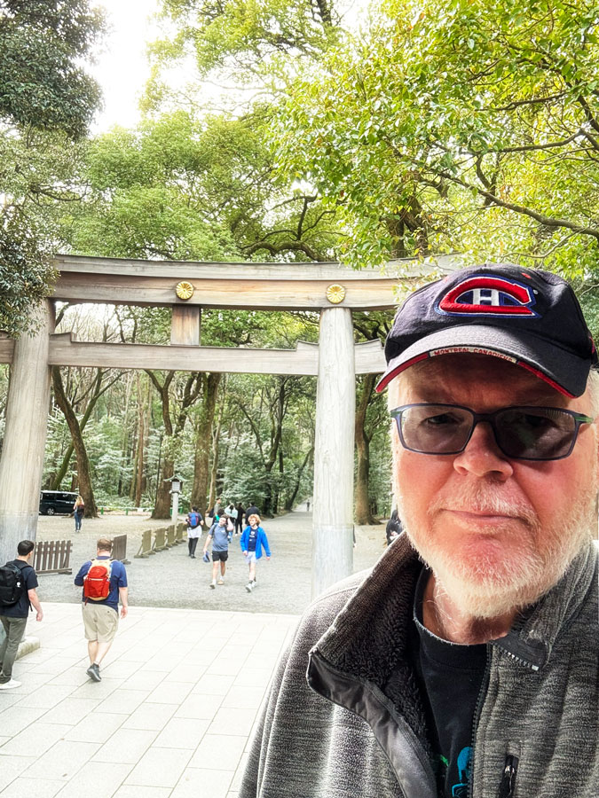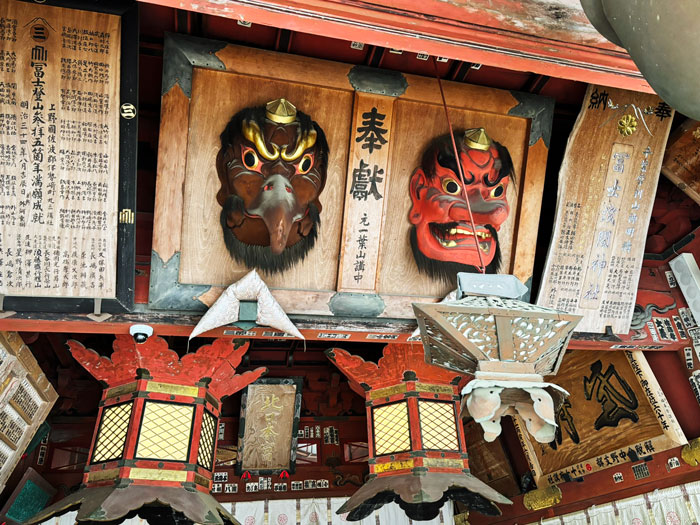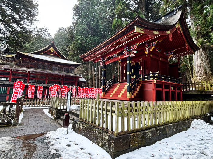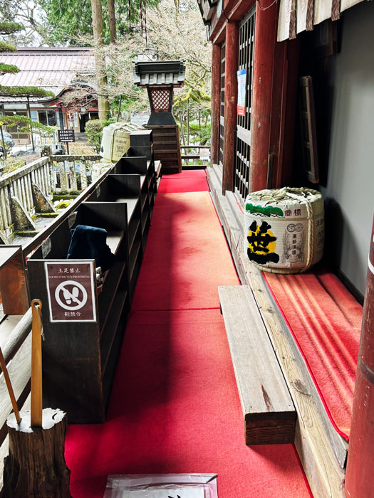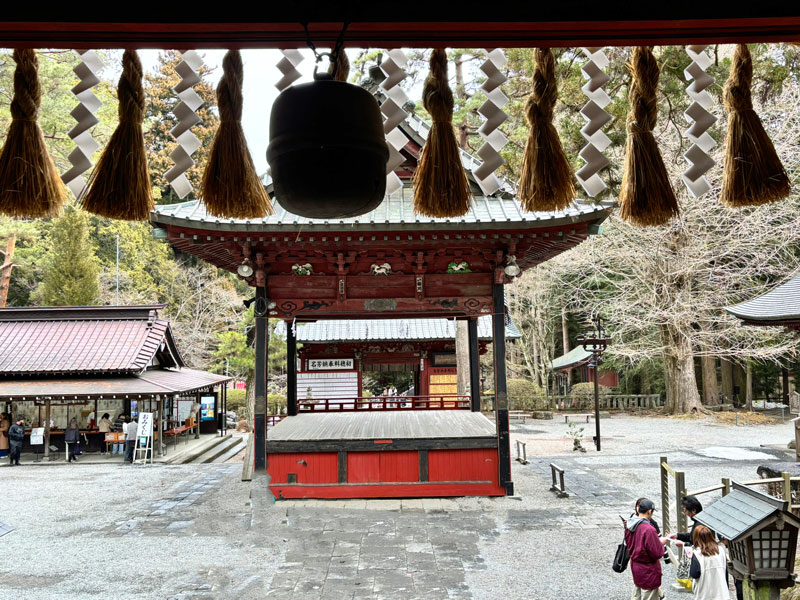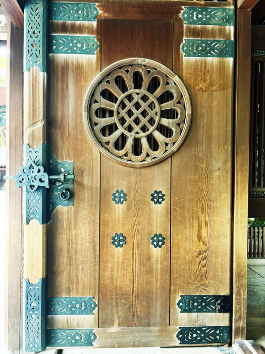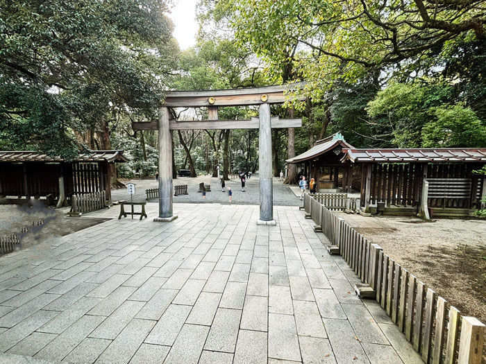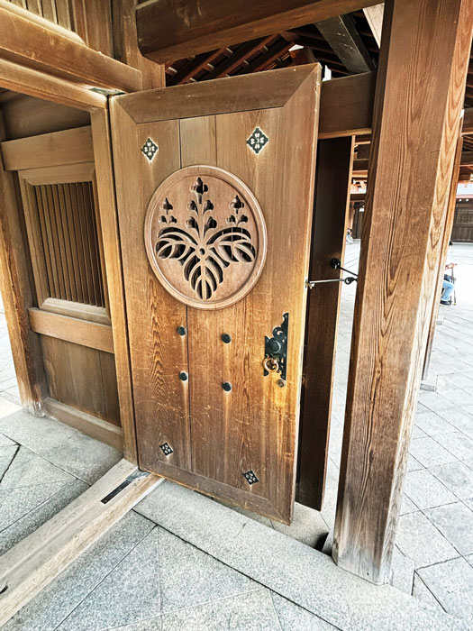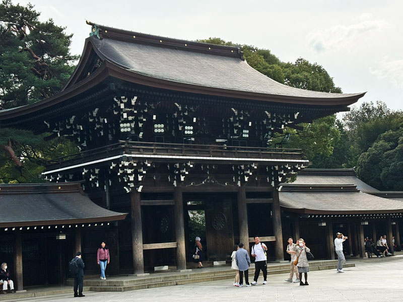 Traditional Japanese temple set amidst tall trees, featuring an intricate roof and wooden architecture. The entrance is adorned with ceremonial decorations.