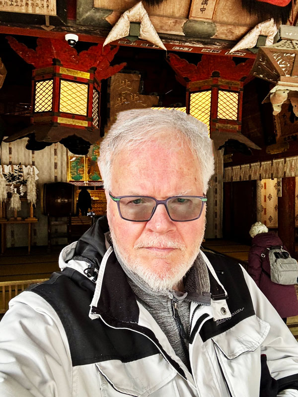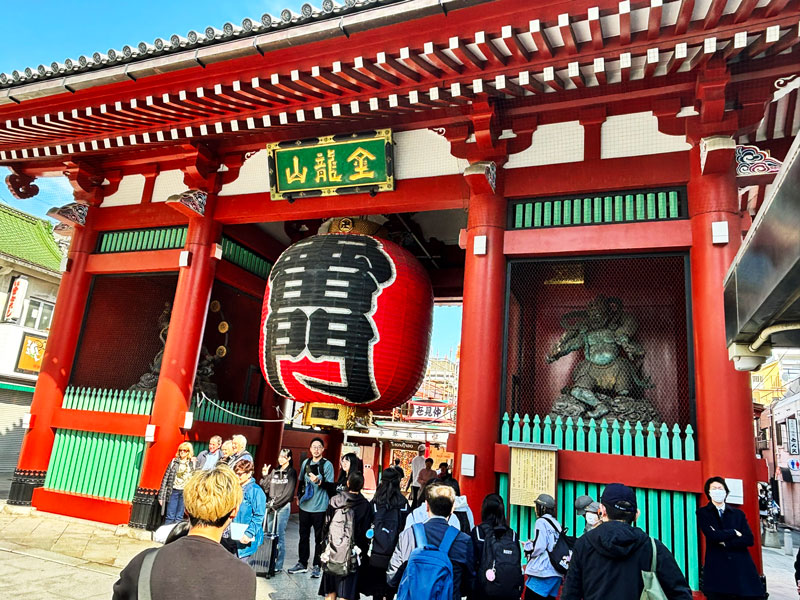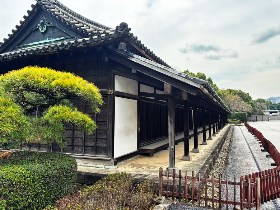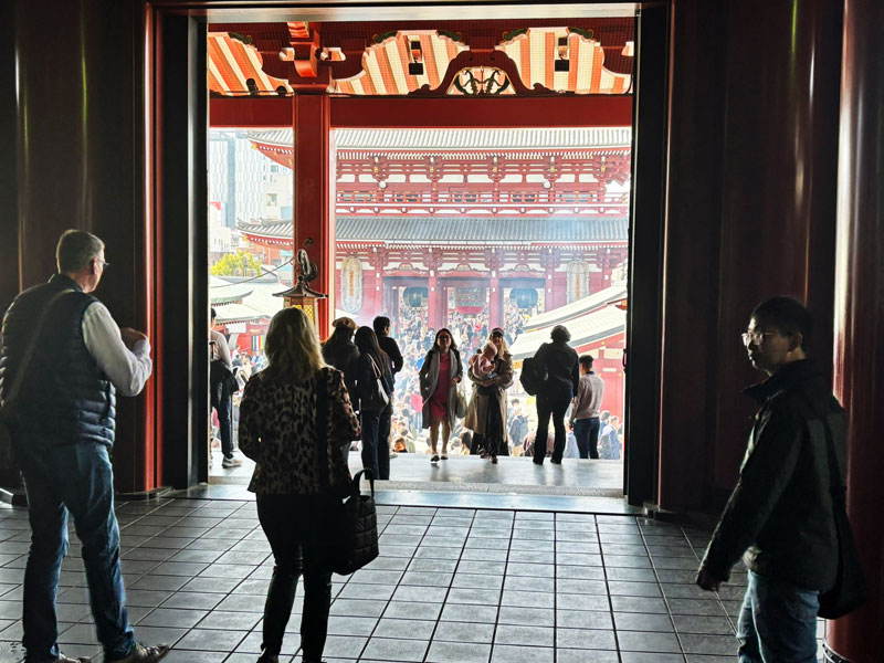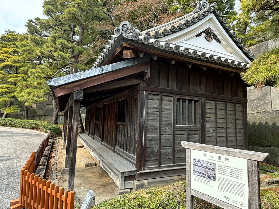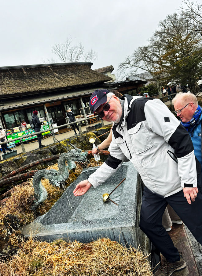 Traditional Japanese temple set amidst tall trees, featuring an intricate roof and wooden architecture. The entrance is adorned with ceremonial decorations.