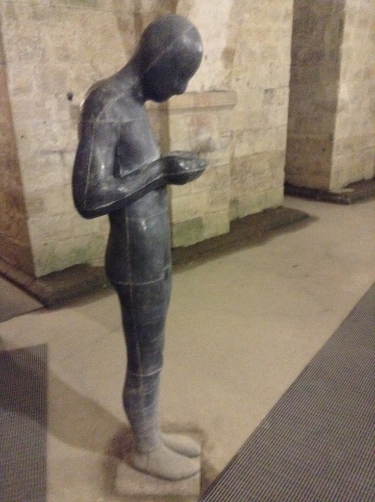 Sound II, statue by Antony Gormley in the flooded crypt. The mysterious statue contemplates the water held in cupped hands. Gormley spoke of the connection of memories to basic elements of the physical world, “Is it possible to do this and make something fresh, like dew or frost – something that just is, as if its form had always been like this.’